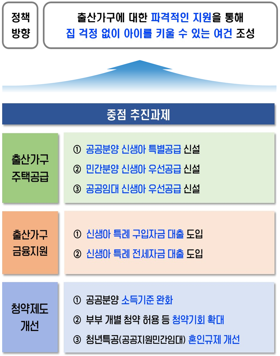 마지막으로, 경제적 요인도 무시할 수 없습니다. 주택 가격의 상승과 그에 따른 경제적 부담은 많은 가정에서 아이를 가지기 주저하게 만드는 요인으로 작용하고 있습니다. 따라서 신생아 가정을 위해 주거 공급의 우선권을 부여하는 것은 이들에게 실질적인 도움을 줄 수 있는 정책으로 여겨집니다.